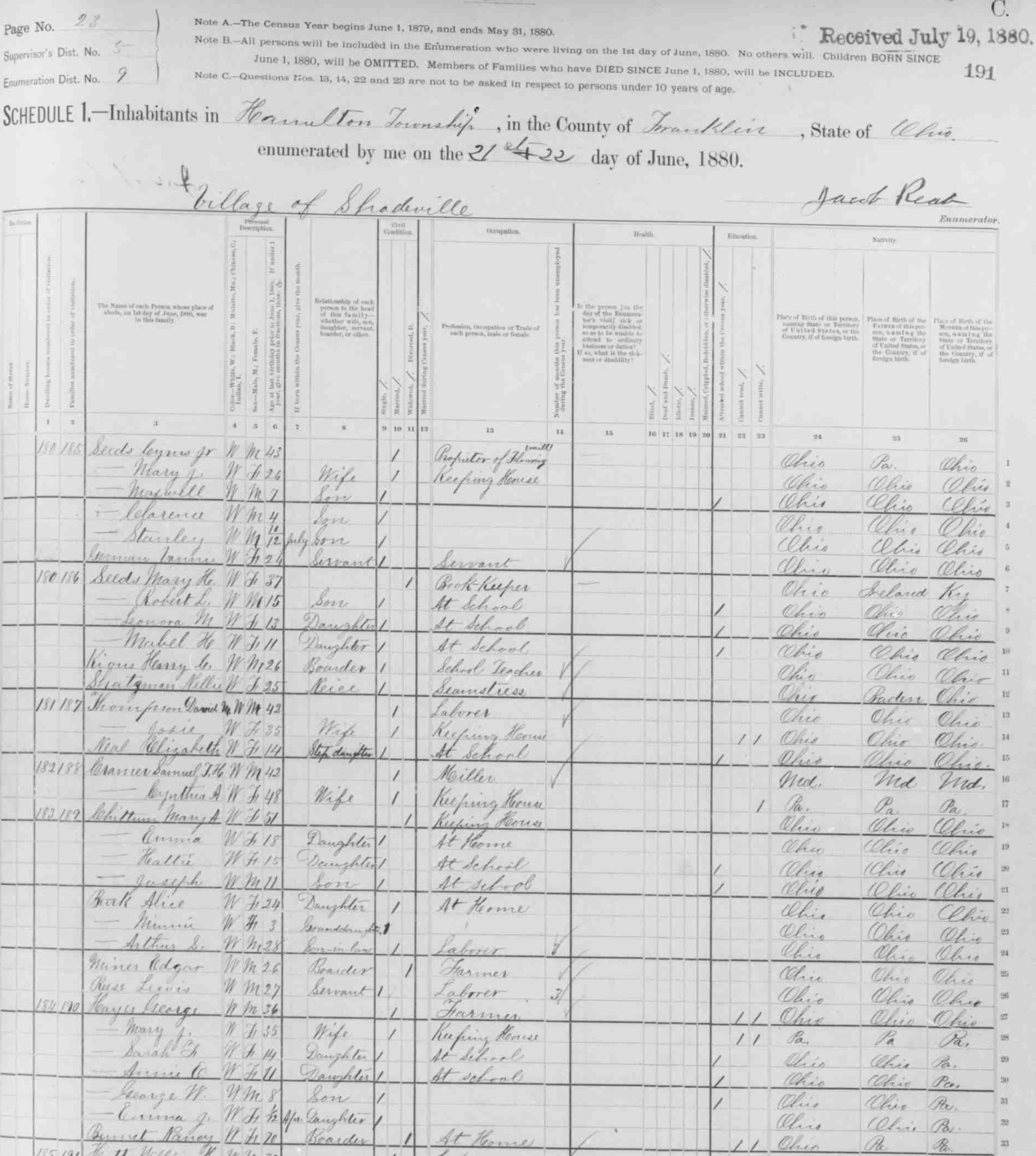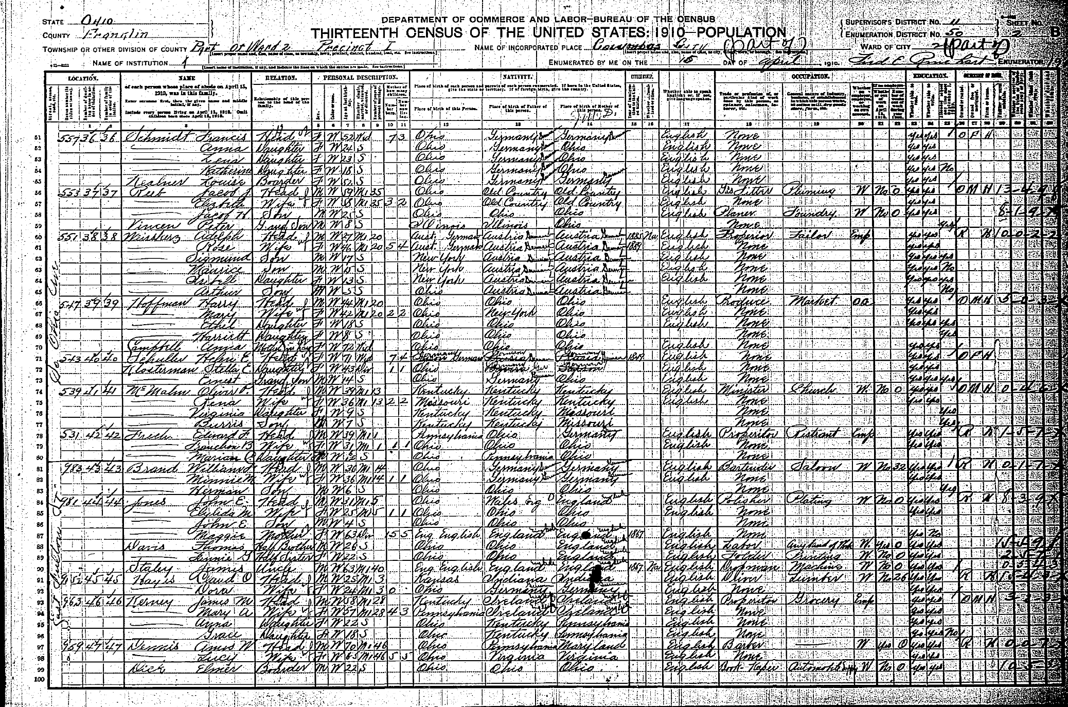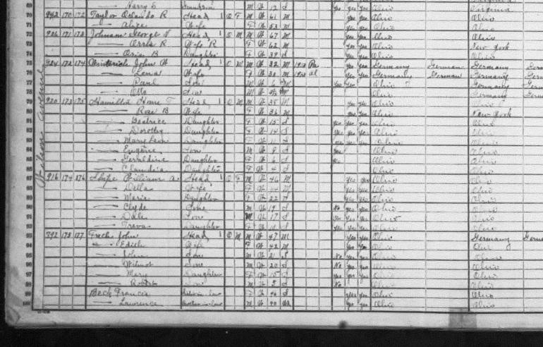 HOME SURNAME LIST NAME INDEX EMAIL US | Page: 7B ED: 67 Image: 1198 He appeared on the census in 1930 in Columbus, Franklin Co., Ohio. Year: 1930 Birthplace: Ohio Roll: T626_1794 Race: White Page: 17A State: Ohio ED: 22 County: Franklin Image: 0205 Township: Columbus He died on 31 Dec 1996 in Columbus, Franklin Co., Ohio. Frech, Robert George Volume: 30938 certificates: 103231 Autopsy: No Gender: Male Date of Death: 31 December 1996 SSN: 291054110 Birth Date: 26 August 1914 Father's Surname: Frech Time of Death: 7:55 PM Age: 82 Birth Place: Columbus, Franklin County, Ohio Marital Status: Married Residence: Ohio Hispanic Origin: Non Hispanic Years of Schooling: 16 Certifier: Physician Referred to Coroner: No Branch of Service: Method of Disposition: Burial Mother's Surname: Beck Place of Death: Hospital/Inpatient Race: White Parents: John M. FRECH and Edith M. BECK. Birth Year <1845> Birthplace OH Age 35 Occupation Keeping Saloon Marital Status M <Married> Race W <White> Head of Household Tillman FRECH Relation Self Father's Birthplace HANOVER Mother's Birthplace HANOVER ---------------------------------------------------------------------- ---------- Source Information: Census Place 1st Ward, Columbus, Franklin, Ohio Family History Library Film 1255016 NA Film Number T9-1016 Page Number 1B Series: T9 Roll: 1016 Page: 1 He was a Saloon Owner in 1890 in Columbus, Franklin Co., Ohio. Frech Bros. Restaurant, Saloon, and Billiard Parlor He died on 4 Jan 1892 in Columbus, Franklin Co., Ohio. He was buried on 7 Jan 1892 in Columbus, Franklin Co., Ohio. Mt. Calvary Cemetery Sec B-Holy Cross Lot 106 Parents: Cybillus FRECH and Euphemia Salome HERMANN. He was married to Cecelia BURKLEY. Children were: William C. FRECH, Edward Tillman FRECH, Ida FRECH, Jennie R. FRECH, Herman S. FRECH, Kate FRECH, Flora H. FRECH, Gertrude FRECH, Bertha FRECH. Race: White Page: 22A State: Ohio ED: 31 County: Franklin Image: 0883 Township: Columbus She died on 20 May 1995 in Canal Winchester, Franklin Co., Ohio. Devine, Virginia May Volume: 30243 certificates: 037566 Autopsy: No Gender: Female Date of Death: 20 May 1995 SSN: 290186416 Birth Date: 25 March 1924 Father's Surname: Frech Time of Death: 9:20 AM Age: 71 Birth Place: Columbus, Franklin County, Ohio Marital Status: Married Residence: Ohio Hispanic Origin: Non Hispanic Years of Schooling: 12 Certifier: Physician Referred to Coroner: No Branch of Service: Army Method of Disposition: Burial Mother's Surname: Johnson Place of Death: Nursing Home Race: White Burried at Veterens cemetery on Rt. 33 Canal Winchester, Ohio Parents: Charles A. FRECH and Hazel C. JOHNSON. She was married to Pearl MESSMORE. She was married to Luke DIVINE. Birth Year <1866> Birthplace OH Age 14 Occupation School Marital Status S <Single> Race W <White> Head of Household John FRECH Relation Son Father's Birthplace WITTENBERG Mother's Birthplace WITTENBERG ---------------------------------------------------------------------- ---------- Source Information: Census Place Columbus, Franklin, Ohio Family History Library Film 1255016 NA Film Number T9-1016 Page Number 122B Series: T9 Roll: 1016 Page: 122 He appeared on the census in 1920 in Columbus, Franklin Co., Ohio. Roll: T625_1380 Page: 1B ED: 56 Image: 944 He appeared on the census in 1930 in Columbus, Franklin Co., Ohio. Age: 63 Year: 1930 Birthplace: Ohio Roll: T626_1795 Race: White Page: 25B State: Ohio ED: 11 County: Franklin Image: 0054 Township: Columbus Relationship: Head Parents: John FRECH and Annie LISTEMAN. He was married to Nettie (FRECH) . Children were: Raymond FRECH. Birth Year <1869> Birthplace PA Age 11 Occupation Goes To School Marital Status S <Single> Race W <White> Head of Household Tillman FRECH Relation Son Father's Birthplace OH Mother's Birthplace GER ---------------------------------------------------------------------- ---------- Source Information: Census Place 1st Ward, Columbus, Franklin, Ohio Family History Library Film 1255016 NA Film Number T9-1016 Page Number 1B Series: T9 Roll: 1016 Page: 1 He was a Court Clerk in 1890 in Columbus, Franklin Co., Ohio. He appeared on the census in 1920 in Columbus, Franklin Co., Ohio. Roll: T625_1380 Page: 5A ED: 23 Image: 260 He appeared on the census in 1930 in Columbus, Franklin Co., Ohio. Age: 61 Year: 1930 Birthplace: Pennsylvania Roll: T626_1793 Race: White Page: 4A State: Ohio ED: 1 County: Franklin Image: 0571 Township: Columbus Relationship: Head He died on 17 Dec 1950 in Columbus, Franklin Co., Ohio. Parents: Tillman FRECH and Cecelia BURKLEY. Page: 7B ED: 67 Image: 1198 He appeared on the census in 1930 in Columbus, Franklin Co., Ohio. Age: 31 Year: 1930 Birthplace: Ohio Roll: T626_1794 Race: White Page: 8A State: Ohio ED: 27 County: Franklin Image: 0531 Township: Columbus Relationship: Head Parents: John M. FRECH and Edith M. BECK. He was married to Francis H. (FRECH) . Children were: June F. FRECH. Family History Library Film 1255058 NA Film Number T9-1058 Page Number 424A She was married to Albert MCKNIGHT on 15 Jan 1865 in Pickaway Co., Ohio. Children were: William MCKNIGHT , Dora A. MCKNIGHT, Iva E. MCKNIGHT, Harley T. MCKNIGHT. He was married to Catherine FINK. Children were: Robert FREY, Paul FREY . She was married to Martin KURZEMANN. Children were: Rosine KURZEMANN, Catherine KURZEMANN, Ulaine (Julianna) KURZEMANN, Justine KURZEMANN , Ferdinand KURZEMANN, Bernard KURZEMANN, Phillipine KURZEMANN. He was married to Appoline WEBER. Children were: Catherine FRIEDRICH. Page: 4A ED: 64 Image: 1115 She died on 30 Apr 1940 in Columbus, Franklin Co., Ohio. She was married to Edward Tillman FRECH. Children were: Marian C. FRECH, Elizabeth F. FRECH, Jane R. FRECH. He was married to Bertha Rose "Bettie" SMITH in 1895. Children were: Eva GERMANN, Floyd GERMANN. She was married to Andrew DAVY on 26 Aug 1847 in Columbus, Franklin Co., Ohio. Found on film #0285142 Children were: Joseph DAVY, James M. DAVY, Samuel S. DAVY, George DAVY, Annie DAVY, Frank B. DAVY, Ida DA