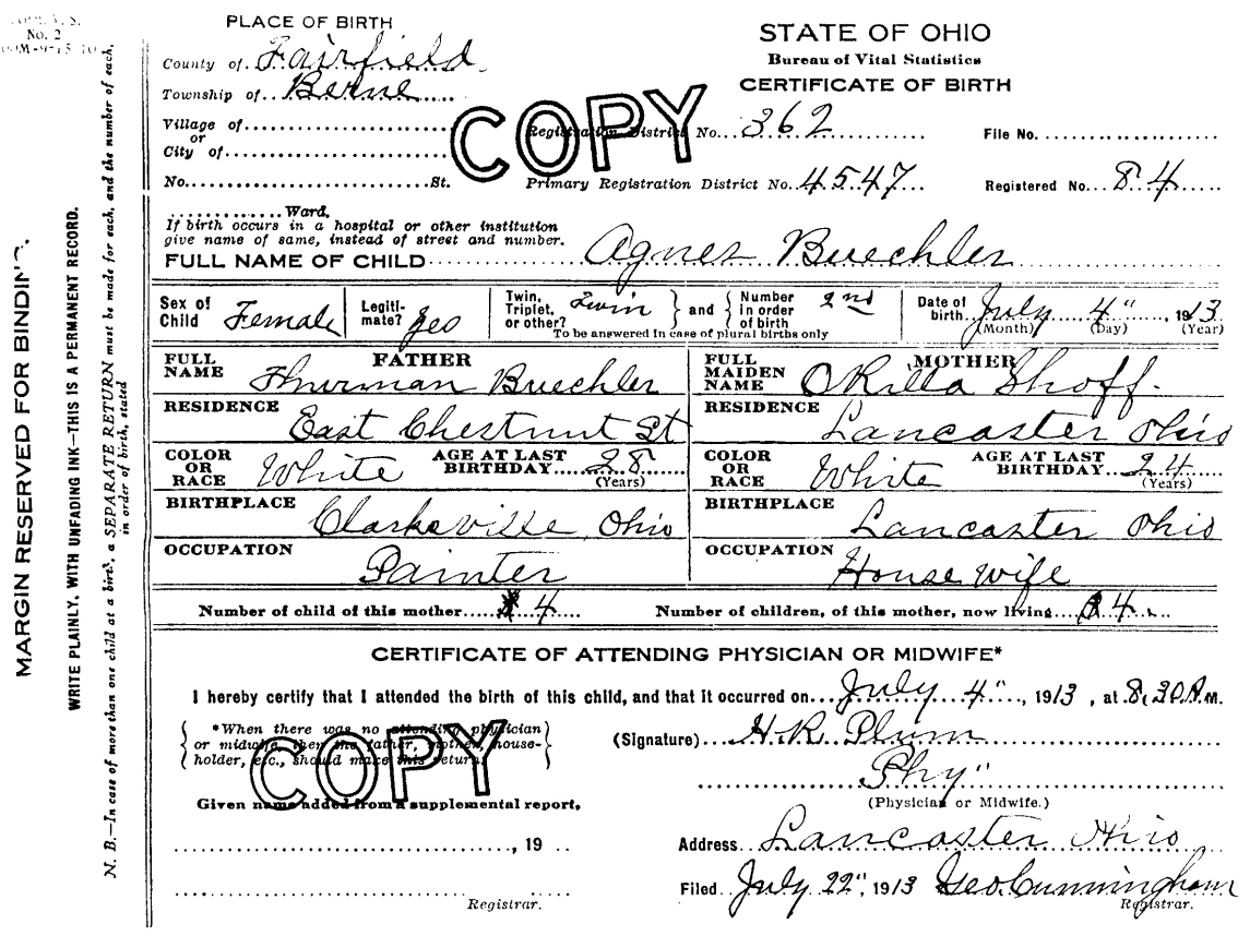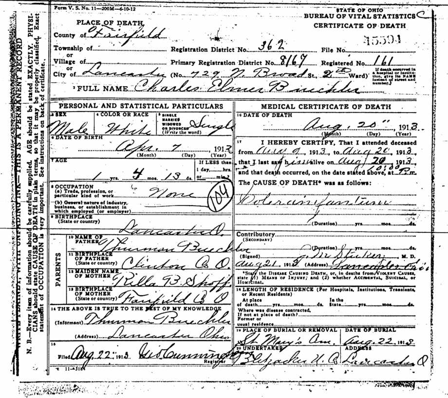 Cert # #31767 on 18 Jun 1910 in Lancaster, Berne Twp., Fairfield Co., Ohio.