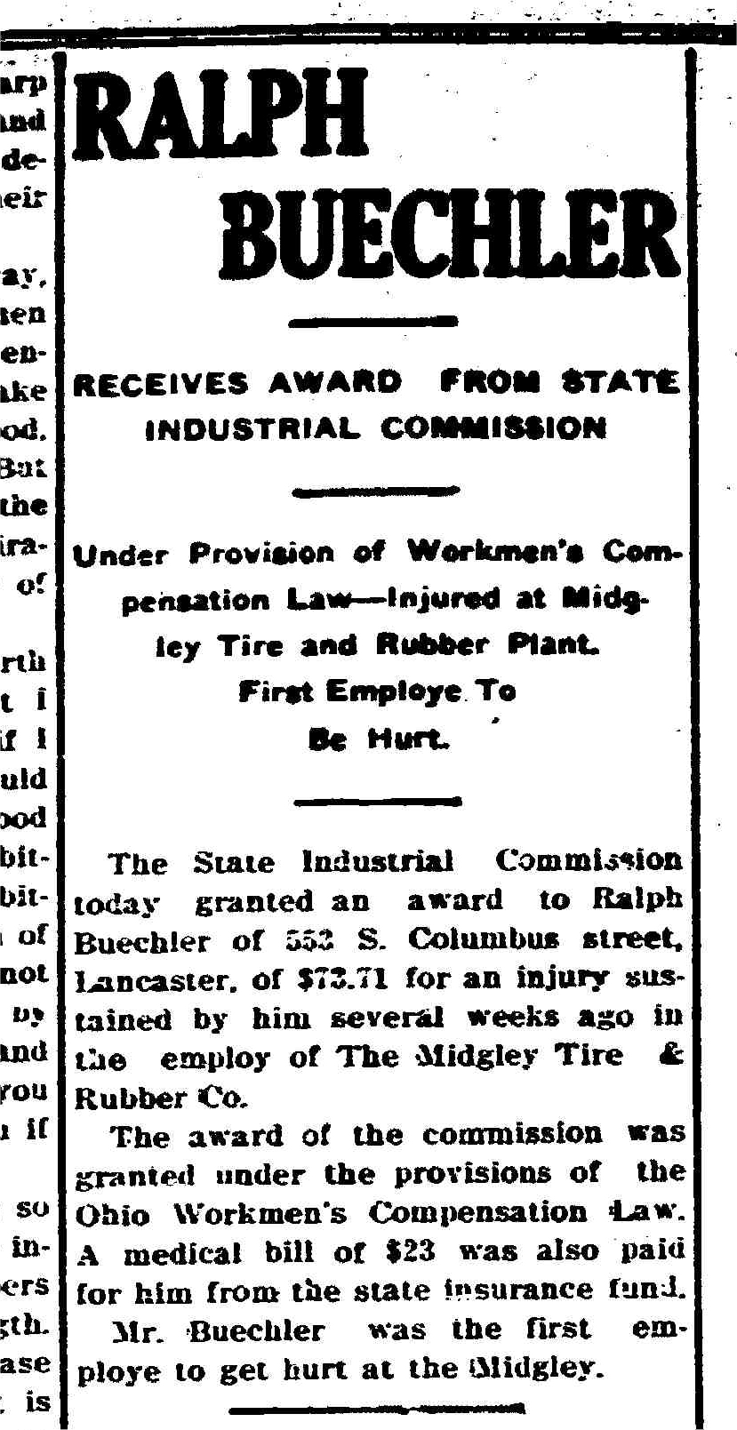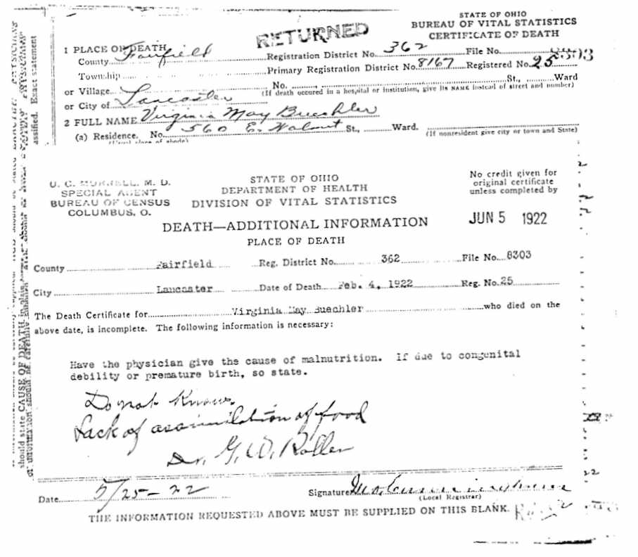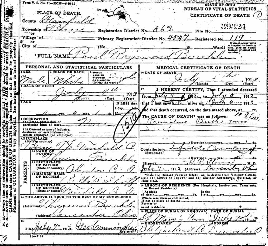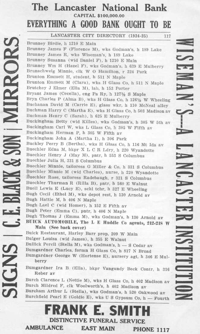HOME SURNAME LIST NAME INDEX EMAIL US | Page: 3A ED: 18 Image: 396 She appeared on the census in 1930 in Lancaster, Rushcreek Twp., Fairfield Co., Ohio. Roll: T626_1792 Race: White Page: 4B State: Ohio ED: 31 County: Fairfield Image: 0009 Township: Rush Creek She died on 16 Mar 1996 in Lancaster, Berne Twp., Fairfield Co., Ohio. Rinehart, Mary Margaret Volume: 30602 certificates: 019039 Autopsy: No Gender: Female Date of Death: 16 March 1996 SSN: 280077630 Birth Date: 04 March 1917 Father's Surname: Buechler Time of Death: 12:45 AM Age: 79 Birth Place: Lancaster, Fairfield County, Ohio Marital Status: Widowed Residence: Ohio Hispanic Origin: Non Hispanic Years of Schooling: 12 Certifier: Physician Referred to Coroner: No Branch of Service: Method of Disposition: Burial Mother's Surname: Shoff Place of Death: Nursing Home Race: White Parents: Thurman R. BUECHLER and Rilla B. SHOFF. She was married to RINEHART . Year: 1930 Birthplace: Deutschland Roll: T626_1794 Race: White Page: 4B State: Ohio ED: 26 County: Franklin Image: 0476 Township: Columbus Relationship: Roomer He was married to Barbara Pflueger FITCH on 29 Dec 1950 in Akron, Summit Co., Oh. Children were: James Robert BUECHLER, Virginia Louise BUECHLER . Sec Holy Mother of God Row 4 He resided til 1840 in Germany. He was a Physician in Lancaster, Hocking Twp., Fairfield Co., Ohio. Educated and practiced in Germany prior to coming to Lancaster He was married to Magdalen (BUECHLER) . Children were: Magdeline BUECHLER, Aloysius B. BUECHLER Sr., Louis A. (Ludwig) BUECHLER . State: OH Color: W Enumeration District: 0147 Birth Place: Ohio Visit: 0107 County: Summit, Akron Relation: Head of Household He died on 21 Jul 1937 in Akron, Summit Co., Oh. Parents: Louis A. (Ludwig) BUECHLER and Rosanna (Rose Ann) WELKER. He was married to Lottie J. SCOTT on 25 Nov 1883 in Gallia County, Ohio. Children were: Harry BUECHLER Sr.. He was divorced from Anna (BUECHLER) in Jun 1915 in Lancaster, Berne Twp., Fairfield Co., Ohio. He was married to Anna (BUECHLER). Page: 3A ED: 18 Image: 396 He appeared on the census in 1930 in Lancaster, Rushcreek Twp., Fairfield Co., Ohio. Roll: T626_1792 Race: White Page: 4B State: Ohio ED: 31 County: Fairfield Image: 0009 Township: Rush Creek He died on 6 Jan 1996. Buechler, Richard R Volume: 30537 certificates: 002875 Autopsy: No Gender: Male Date of Death: 06 January 1996 SSN: 273142191 Birth Date: 19 September 1919 Father's Surname: Buechler Time of Death: 7:15 AM Age: 76 Birth Place: Fairfield County, Ohio Marital Status: Married Residence: Ohio Hispanic Origin: Non Hispanic Years of Schooling: 12 Certifier: Physician Referred to Coroner: No Branch of Service: Army Air Corps Method of Disposition: Burial Mother's Surname: Baugher Place of Death: Nursing Home Race: White Parents: Thurman R. BUECHLER and Rilla B. SHOFF. Age: 76 State: OH Color: W Enumeration District: 0068 Birth Place: GER Visit: 0058 County: Fairfield, Lancaster City Relation: Head of Household Other Residents: Daughter Rose 37 Ohio She appeared on the census in 1920 in Lancaster, Berne Twp., Fairfield Co., Ohio. Roll: T625_1378 Page: 1B ED: 22 Image: 527 She appeared on the census in 1930 in Lancaster, Berne Twp., Fairfield Co., Ohio. Age: 56 Year: 1930 Birthplace: Ohio Roll: T626_1791 Race: White Page: 11B State: Ohio ED: 20 County: Fairfield Image: 0933 Township: Lancaster Relationship: Sister-in-law She died on 19 Feb 1961 in Lancaster, Berne Twp., Fairfield Co., Ohio. BUECHLER, ROSE Death Date: 19 February 1961 Age: 88 Place of Death: Lancaster, Fairfield County Residence: Lancaster, Fairfield County Gender: Female Race: White Marital Status: Never Married certificates: 10178 Volume: 16427 Parents: Louis A. (Ludwig) BUECHLER and Rosanna (Rose Ann) WELKER. Year: 1930 Birthplace: Ohio Roll: T626_1791 Race: White Page: 11B State: Ohio ED: 20 County: Fairfield Image: 0933 Township: Lancaster Relationship: Sister-in-law Parents: Aloysius B. BUECHLER Sr. and Mary Magdalena WAGNER. Age: 25 State: OH Color: W Enumeration District: 0058 Birth Place: Ohio Visit: 0117 County: Franklin, Columbus Relation: Head of Household Other Residents: Relation Name Color Age Birth Place Wife Rose G 26 Ohio Daughter Margaret 02 Ohio She appeared on the census in 1920 in Sydney, Shelby Co., Ohio. Year: 1920 Roll: T625_1437 Page: 1B State: Ohio ED: 199 County: Shelby Image: 134 Township: Clinton She resided 878 Harrison Ave. in Jul 1921 in Columbus, Franklin Co., Ohio. She died on 27 Jul 1921 in Columbus, Franklin Co., Ohio. She Death Cert # 38648 on 27 Jul 1921 in Columbus, Franklin Co., Ohio. She was buried on 29 Jul 1921 in Columbus, Franklin Co., Ohio. Mt. Calvary sec E-Holy Cross lot 72 Parents: Frank Anthony BUECHLER and Mary FINKBONE. She was married to Herbert Bernard MILLER. Children were: Margaret MILLER, Herbert F. MILLER. Death Date: 04 June 1989 Birth Date: 02 January 1900 Birth State: Ohio Death State: Education: Elementary or Secondary Race: White Gender: Male certificates: 27735 Volume: 040730 Father: BUECHLER Time of Death: 99:99 Hispanic: Non-Hispanic Age: 89 Years Residence: Ohio Marital Status: Widowed SSN: 282050703 He was married to Carol Ann GOWIN on 22 Mar 1968 in Monroe, Michigan. Children were: Michael Sean BUECHLER, JoAnn BUECHLER. Page: 3A ED: 18 Image: 396 He was a Painter in 1922 in Lancaster, Berne Twp., Fairfield Co., Ohio. He resided 560 E. Walnut St. in 1924 in Lancaster, Berne Twp., Fairfield Co., Ohio. He appeared on the census in 1930 in Lancaster, Rushcreek Twp., Fairfield Co., Ohio. Age: 45 Year: 1930 Birthplace: Ohio Roll: T626_1792 Race: White Page: 4B State: Ohio ED: 31 County: Fairfield Image: 0009 Township: Rush Creek Relationship: Head He died on 6 Sep 1930 in Bremen, Fairfield Co., Ohio. Pulmonary Tuberculosis He was buried on 9 Sep 1930 in Lancaster, Hocking Twp., Fairfield Co., Ohio. Forest Rose Cemetery He Death Cert # 26160 in Bremen, Fairfield Co., Ohio. Parents: Charles BUECHLER and Minnie May CAMP. He was married to 